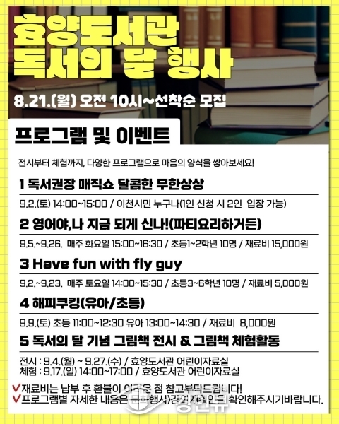 (경인뷰) 이천시 이천시립효양도서관에서 9월 독서의 달을 맞아 이천시민의 독서 의욕을 고취 시키고 책 읽는 즐거움을 함께 나누고자 독서의 달 행사를 운영한다.