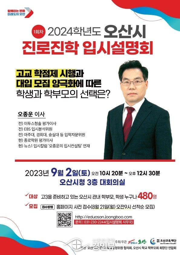 (경인뷰) 오산시는 고3을 준비하는 오산시 관내 학생 및 학부모를 위한 진로진학 입시설명회를 9월 2일 오산시청 3층 대회의실에서 개최한다.