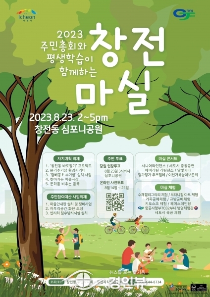 (경인뷰) 이천시 창전동 주민자치회는 오는 23일 심포니공원에서 2023년 주민총회와 평생학습발표회가 함께하는 ‘창전마실’ 행사를 진행한다고 밝혔다.