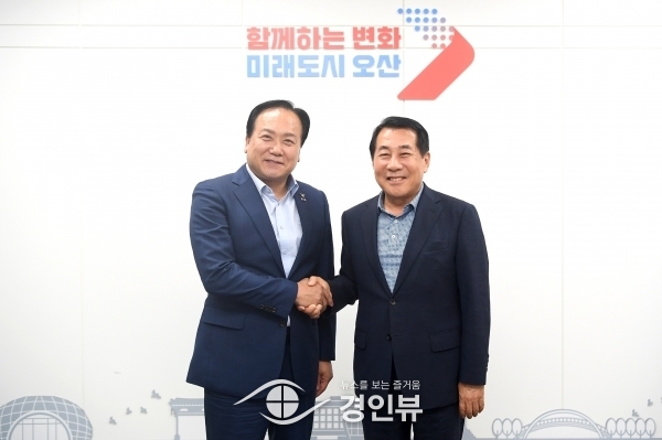(경인뷰) 이권재 오산시장이 18일 오후 도시행정 수범사례를 벤치마킹하기 위해 오산을 방문한 나동연 경남 양산시장 일행을 접견했다.