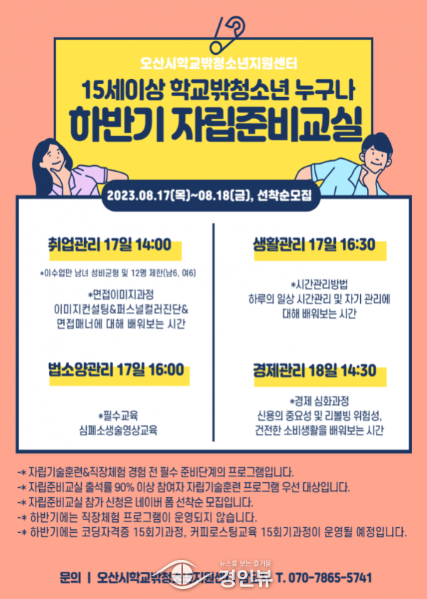 (경인뷰) 오산시학교밖청소년지원센터는 학교 밖 청소년을 대상으로 성공적인 자립단계 훈련을 위해 하반기 자립‘준비’교실을 8월 17일 18일 5시간 과정으로 진행했다.