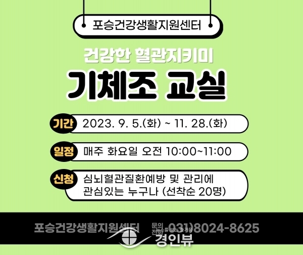 포승건강생활지원센터 관계자는 “센터를 찾아주시는 주요층인 심뇌혈관질환자 및 어르신의 높은 건강관심도에 부응하기 위해 마련된 기체조 교실에 많은 관심과 참여 부탁드린다”고 전했다.