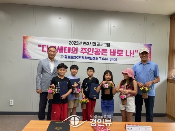 (경인뷰) 이천시 장호원읍주민자치학습센터는 21일 다음세대의 주인공이 될 초등학생 8명이 참여한 민주시민 ‘다음세대의 주인공은 바로 나’ 프로그램을 종강하고 수료식을 했다고 밝혔다.