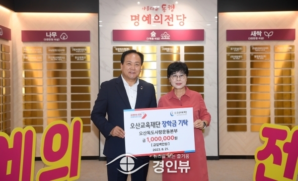 (경인뷰) 오산시는 지난 21일 시청 1층 명예의 전당에서 오산독도사랑운동본부로부터 특기생 인재 육성을 위한 장학금 100만원을 기탁받았다고 밝혔다.