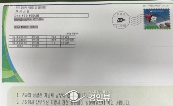 (경인뷰) 안성시 징수과에서는 지난 16일 청렴도 향상을 위해 환급안내문에 청렴문구를 삽입해 제작 발송했다.