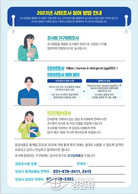 (경인뷰) 안성시는 오는 9월 1일부터 15일까지 제11회 2023년 안성시 사회조사를 실시한다.