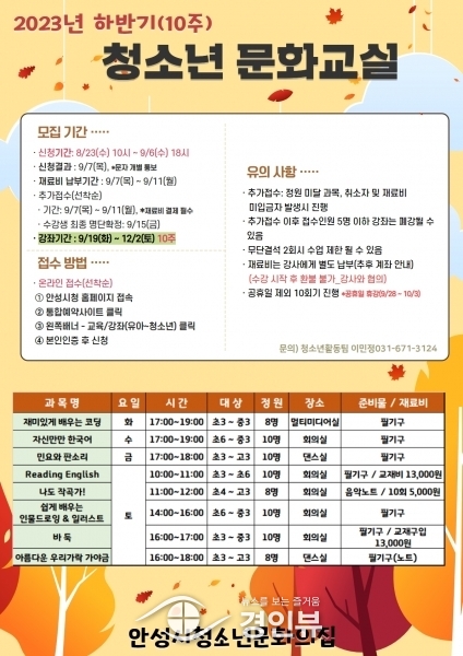 (경인뷰) 안성시청소년문화의집은 8월 23일부터 9월 6일까지 ‘2023년도 하반기 청소년 문화교실’ 수강생을 선착순으로 모집한다.