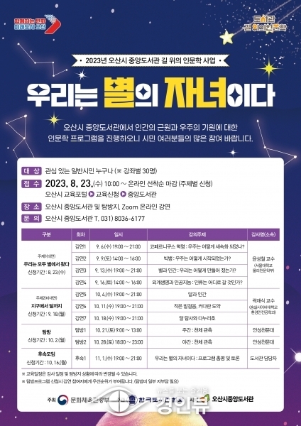 한현 중앙도서관장은 “쳇바퀴 같은 일상에 벗어나 끝을 알 수 없는 미지의 세계인 우주에 대해 알아보고 그를 통해 우리 인간의 시작과 근원은 무엇인지 인문학 강연을 통해 탐구해보는 계기가 되길 바란다”고 전했다.