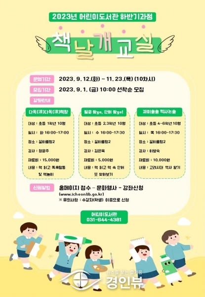 제33기 ‘책날개 교실’은 이천시 거주 초등학생을 대상으로 1학년, 4~6학년 총 3개 반으로 구성되며 오는 9월 12일부터 11월 23일까지 매주 화, 수, 목요일 10차시 수업으로 운영될 예정이다.