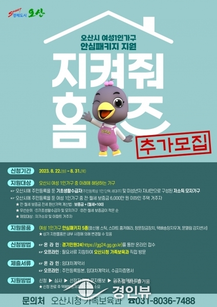 (경인뷰) 오산시가 8월 말까지 범죄에 노출되기 쉬운 여성 1인 가구에 호신용품을 지원하는‘안심패키지 지원사업’대상자를 추가로 모집한다.