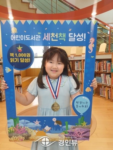 김하린 어린이는 8월 11일 어린이도서관에 방문해 세천책 달성 인증서와 메달을 받았다.