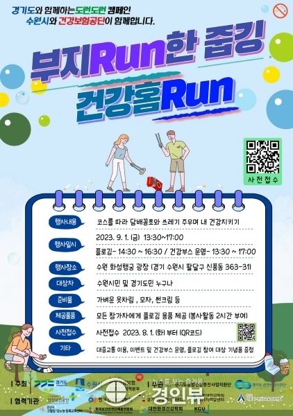 수원시보건소와 경기도, 국민건강보험공단 인천경기지역본부가 공동 주최하는 ‘부지RUN한 줍깅 건강홈RUN’은 9월 1일 오후 1시 30분부터 5시까지 열린다.