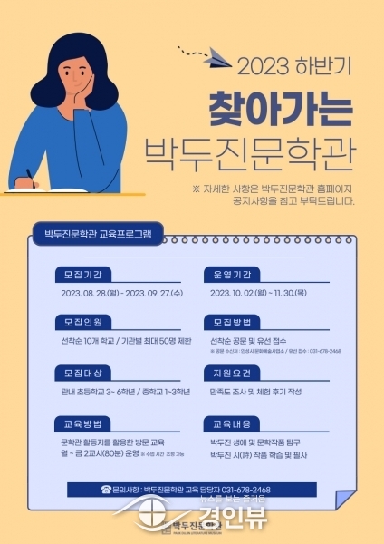 (경인뷰) 안성시 박두진문학관은 8월 28일부터 9월 27일까지 2023년 하반기‘찾아가는 박두진문학관’에 참여할 관내 초·중학교를 모집한다고 밝혔다.