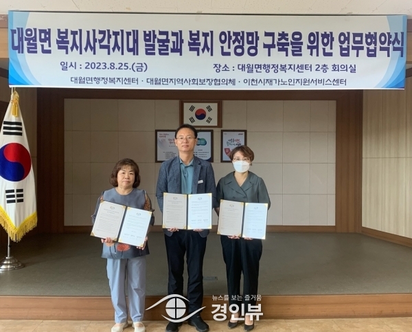 (경인뷰) 이천시 대월면 행정복지센터와 대월면 지역사회보장협이체는 25일 노인 복지사각지대 발굴과 지원 활성화를 위해 이천시재가노인지원서비스센터와 업무협약을 체결했다.