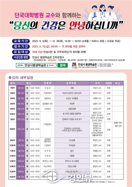 수강신청 기간은 2023년 8월 18일부터 각 회차별 강연 시작전까지 30명 선착순 모집이며 관심있는 진료과별로 안성시평생학습관 홈페이지에서 수강신청 하면 되며 기타 자세한 사항은 안성시 평생학습관으로 문의하면 된다.