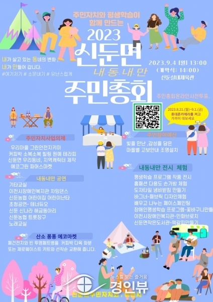 2023년 신둔면 주민총회는 오는 9월 4일 오후 1시부터 특별히 평생학습 발표회와 함께 개최하는 자리를 만들어 패브릭 디자인 체험, 민화브로치 체험 등의 다양한 체험부스와 평생학습 프로그램 전시행사로 시작하며 해금동아리 공연, 트롯장구 등 다채로운 공연이 주민총회와 함께 진행된다아울러 산소퐁퐁 에코마트 부스에서는 지속가능한 주민자치 사업의 일환으로 폐건전지와 투명폐트병을 가지고 오면 커피박 다육 화분 또는 제로웨이스트 키트를 선착순 교환해주어 자원순환을 통한 생활환경 실천의 계기를 마련해 작은 참여 하나가 큰 실천이 될 수 있다는 인식을 심어주고자 기획됐다.
