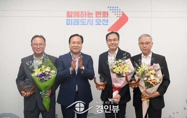 (경인뷰) 오산시는 지난 29일 시장 집무실에서 미래교육 활성화 및 공동체적 교육문화 조성에 기여하고 교직 생활을 마무리하는 관내 학교장 3명과 교육 발전에 이바지하고 후진 양성을 위해 타 기관으로 전출하는 학교장 1명에게 각각 공로패를 전달했다.