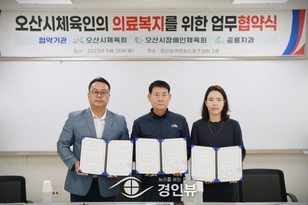 (경인뷰) 오산시체육회와 오산시장애인체육회는 지난 28일 오산오색문화체육센터에서 공룡치과와 ‘오산시 체육인 의료복지를 위한 업무협약’을 체결했다.