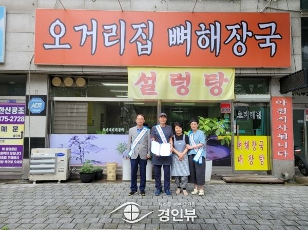 (경인뷰) 오산시 남촌동이 지난 30일 주변의 어려운 이웃을 위해 식사를 제공할 뿐만 아니라 남촌동 명예사회복지공무원으로서 복지사각지대 이웃 발굴에 적극적으로 참여해 온 ‘오거리집 설렁탕’ 육이균 대표에게 감사의 마음을 전했다.