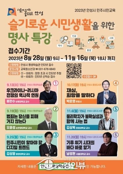 올해 안성시는 ‘슬기로운 시민생활을 위한 강의’를 부제로 안성시민을 대상으로 9월 13일 19일 25일에 안성시 평생학습관에서 ‘2023년 안성시 민주시민교육’을 진행한다.