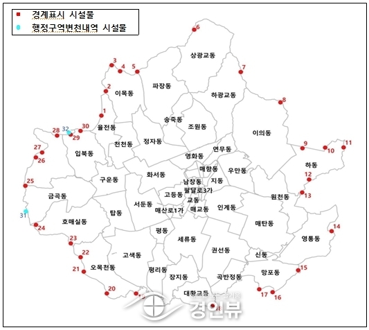 (경인뷰) 수원시가 지난 3~8월 수원시 경계를 알려주는 역할을 하는 경계시설물을 전수조사한 결과, 훼손된 경계시설물은 없는 것으로 나타났다.