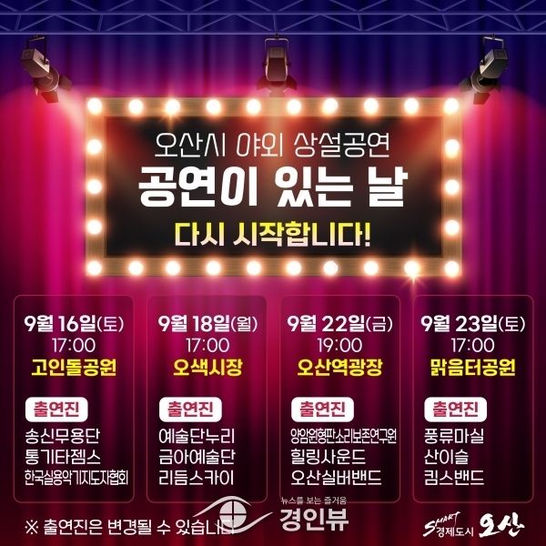 (경인뷰) 오산시는 7~8월 휴식기를 마치고 9월부터 오산 야외 상설공연 ‘공연이 있는 날’ 사업을 재개한다고 밝혔다.