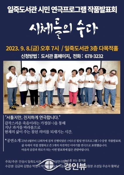 (경인뷰) 안성시 일죽도서관에서는 오는 9월 8일 금요일 시민 참여 연극 ‘시체들의 수다’를 무대에 올린다고 밝혔다.
