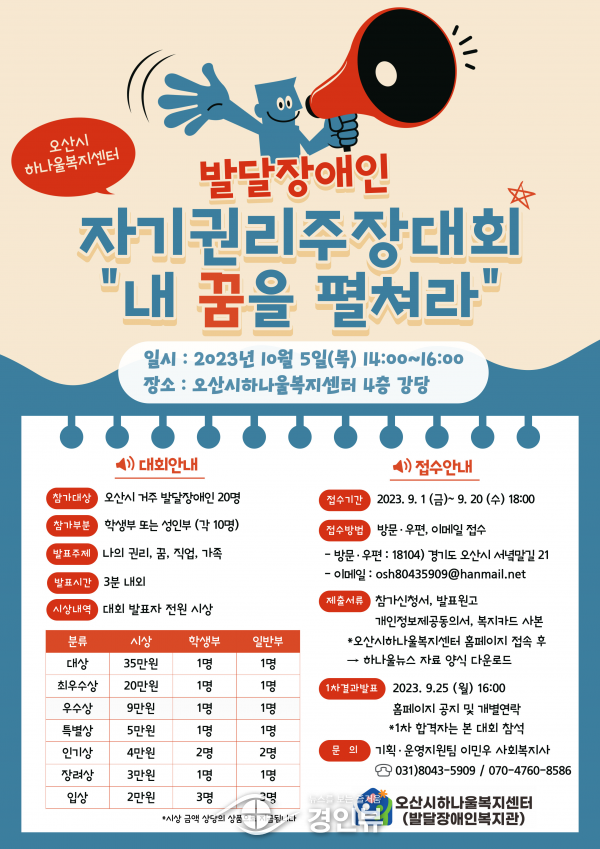 (경인뷰) 오산시하나울복지센터는 9월 20일까지 3주간 발달장애인을 대상으로 ‘자기 권리 주장대회’ 참가자를 모집한다.