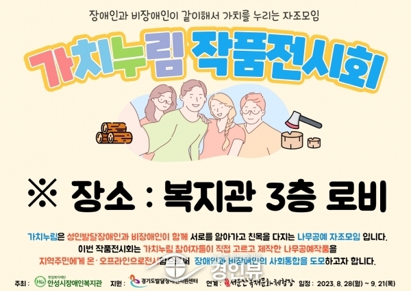 (경인뷰) 안성시장애인복지관은 2023년 8월 28일부터 9월 21일까지 25일간 복지관 3층 로비에서 장애인과 비장애인이 “같이해서 가치를 누리는 자조모임 가치누림” 작품전시회를 진행한다고 밝혔다.