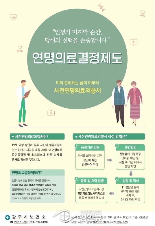 조정호 광주시 보건소장은 “존엄한 죽음에 대한 성찰을 통해 삶의 마무리에 대한 자기 결정권을 존중하는 문화가 확산될 수 있도록 노력하겠다”고 밝혔다.