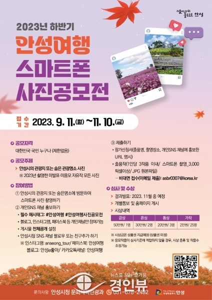 (경인뷰) 안성시는 이달 11일 ‘2023년 하반기 안성여행 스마트폰 사진공모전’을 개최한다고 밝혔다.