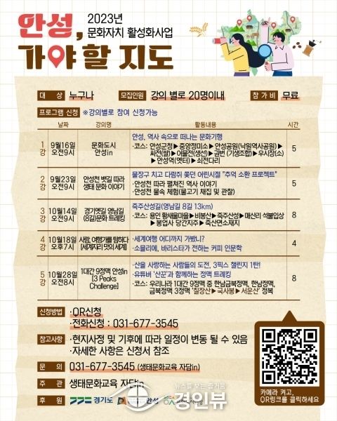 (경인뷰) 안성시는 경기도 문화자치 활성화 사업 일환으로 진행되는 안성 문화자치 활성화 사업 ‘안성 가야 할 지도’ 프로그램 참여자를 모집한다고 밝혔다.