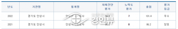 안성시 사회조사는 2021년 양호 등급에서 2022년 우수 등급을 받는 소정의 성과를 달성했다.