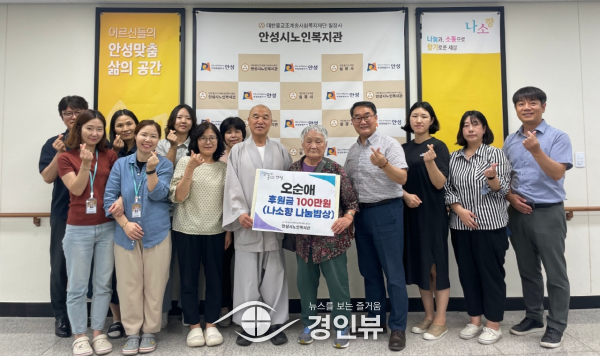이날 후원금 전달식에는 오순애 회원과 안성시노인복지관 운영지원사찰 칠장사주지 지강스님을 비롯한 복지관 직원들이 참석했다.