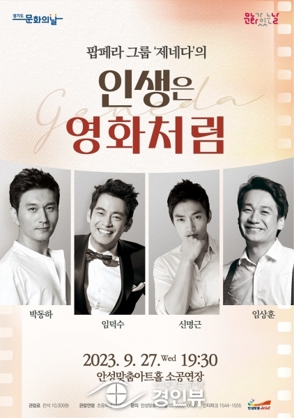 (경인뷰) 안성맞춤아트홀은 9월 문화가 있는 날 기획 공연으로 27일 저녁 7시 30분, 안성맞춤아트홀 소공연장에서 팝페라 그룹 제네다의 ‘인생은 영화처럼’공연을 선보인다.