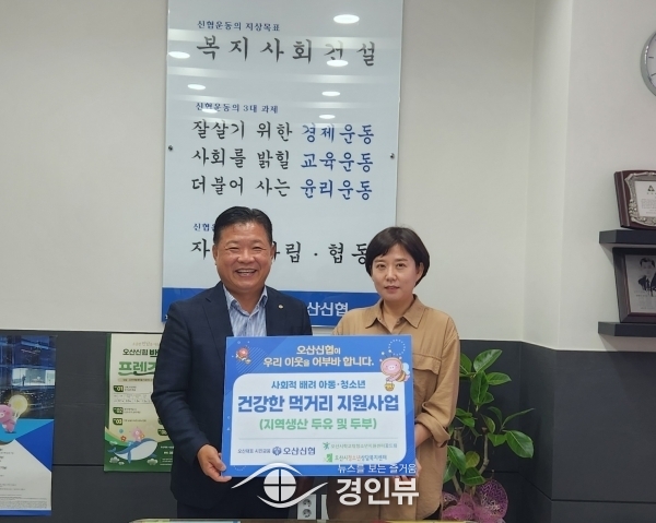 (경인뷰) 오산신협이 지난 12일 오산시청소년상담센터와 꿈드림을 이용하는 아동·청소년에게 건강한 먹거리를 제공하자는 취지로 매달 3회씩 지역에서 생산한 두유와 두부 등을 기탁하기로 했다.