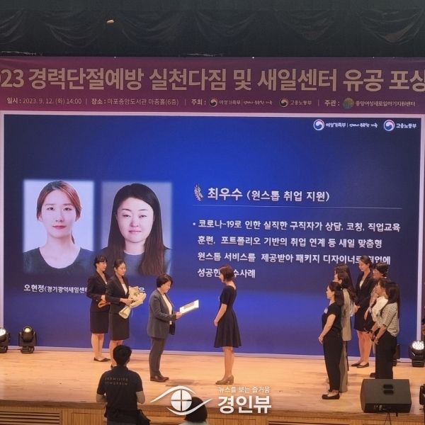 (경인뷰) 안성시는 지난 12일 여성가족부 주최, 2023년 경력단절예방 선포 및 새일센터 유공 포상식에서 ‘원스톱 취업지원 분야’에 안성시 취업상담사 오현정, 취업대상자 김재은이 최우수상을 수상했다고 밝혔다.