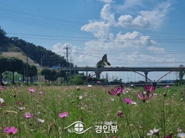 (경인뷰) 금광면이장단협의회에서 금광면의 금광저수지 하류 조령천 둔치에 지난 봄에 식재한 코스모스들이 추석 연휴를 맞아 만개하면서 청명한 가을하늘 아래 가을의 정취를 느끼게 해준다.