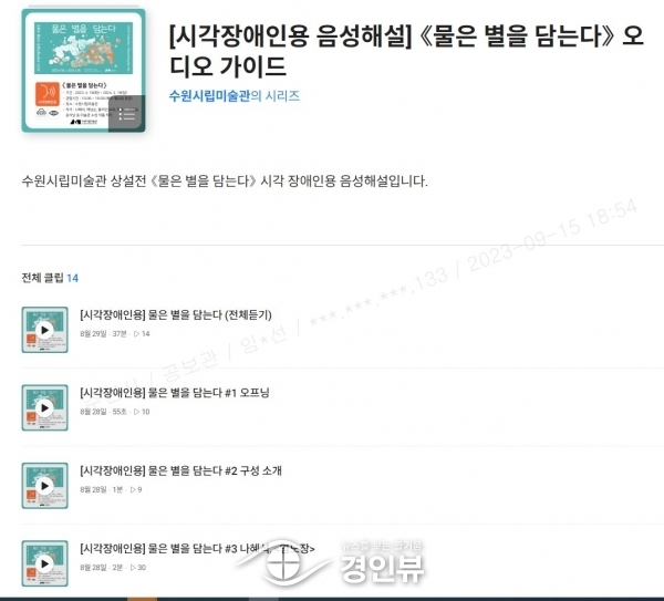(경인뷰) 수원시가 시각장애인들이 수원시립미술관 소장품 상설전 ‘물은 별을 담는다’의 전시 작품을 음성으로 감상할 수 있도록, 작품을 소개하는 ‘오디오 도슨트’를 제작했다.
