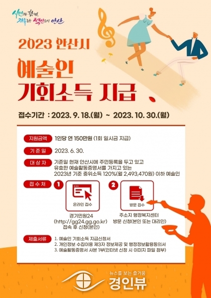 (경인뷰) 안산시는 사회적 가치를 창출하는 예술인이 정당한 보상을 통해 창작활동에 전념할 수 있도록 ‘예술인 기회소득’ 지급을 추진한다고 18일 밝혔다.