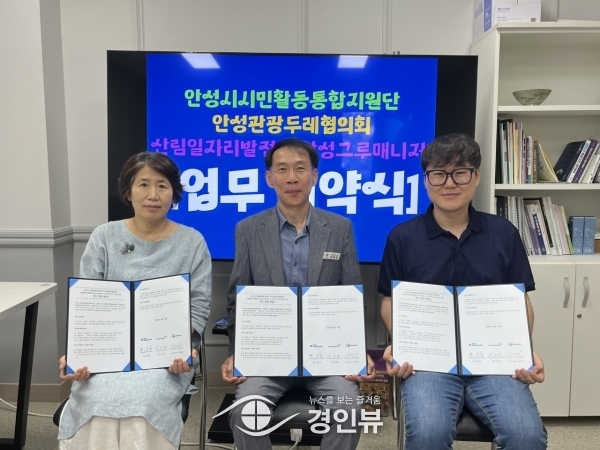 (경인뷰) 안성시는 지난 12일 안성시시민활동통합지원단과 안성관광두레협의회, 산림일자리발전소간의 상호발전을 도모하기 위해 전략적 파트너쉽에 관한 협정을 체결했다.