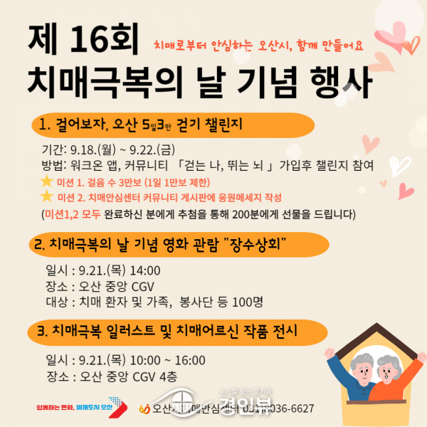 (경인뷰) 오산시보건소 치매안심센터는 ‘제16회 치매극복의 날’을 맞아 치매 예방의 중요성을 알리고 치매에 대한 인식을 개선하고자 오는 9월 22일까지 치매극복의 날 기념행사를 개최한다고 밝혔다.