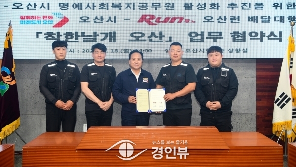 (경인뷰) 오산시는 18일 어려운 이웃을 알리고 살피는 명예사회복지공무원 운영 활성화를 위해 오산런 배달대행과 ‘착한날개 오산’업무 협약식 개최했다고 밝혔다.