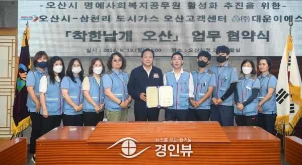 (경인뷰) 오산시가‘삼천리 도시가스 오산고객센터 ㈜대운이에스’와 지난 18일 명예사회복지공무원 운영 활성화를 위한‘착한날개 오산’업무 협약식을 개최했다고 밝혔다.
