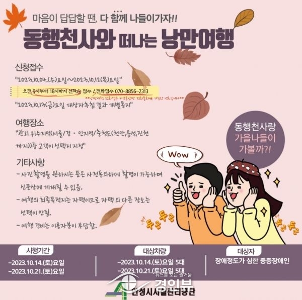 (경인뷰) 안성시시설관리공단에서 운영하는 교통약자이동지원센터“동행천사”는 10월14일 10월21일 2일간 단풍맞이 차량지원 서비스인 “동행천사와 떠나는 낭만여행”을 실시한다고 밝혔다.