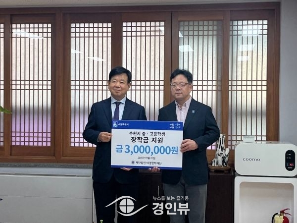 (경인뷰) 아주대학교 공익 재단법인 아경장학재단이 21일 “수원시 취약계층 중·고등학생 장학금으로 사용해달라”며 장학금 300만원을 수원시에 전달했다.
