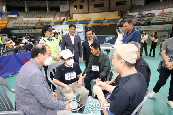 (경인뷰) 수원시의회 김기정 의장과 이재식 부의장을 비롯한 시의원들은 21일 수원종합운동장에서 열린 ‘제19회 수원특례시 장애인한마음체육대회’에 참석한 선수단과 응원에 나선 보호자 및 시민들을 격려했다.
