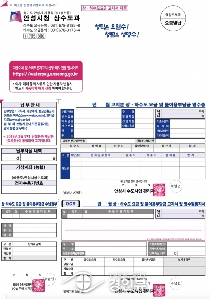 (경인뷰) 안성시 상수도과는 반부패᠂청렴문화를 확산하기 위해 이달부터 상수도 고지서에 청렴문구를 삽입한 청렴고지서를 만들어 발송하고 있다고 밝혔다.