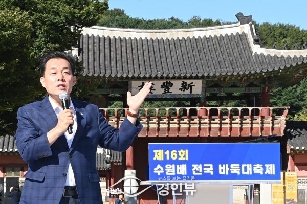 24일 행궁광장에서 열린 제16회 수원배 전국 바둑대축제에서 기념사를 한 이재준 시장은 “오늘 승부를 떠나 ‘한수 배웠다’라는 바둑 본연의 의미를 되새기고 가을이 풍성한 수원에서 좋은 추억을 남기길 바란다”고 밝혔다.