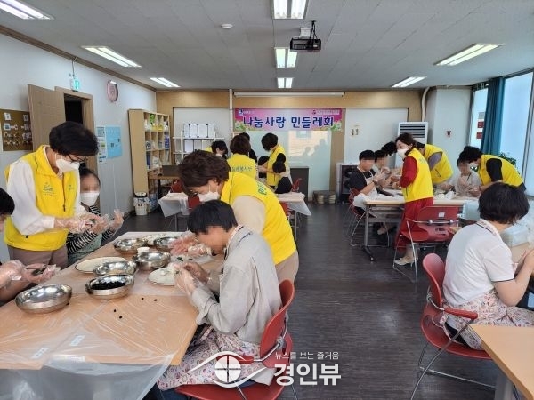 수원시 나눔사랑민들레봉사단 회원 등 20여명은 에이블 장애인직장 적응 훈련센터 훈련생들과 함께 송편, 강정을 만들어 먹었다.